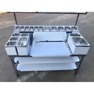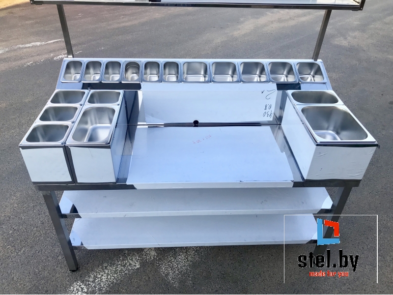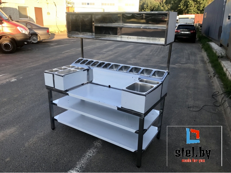 Изделие состоит из стола, холдеров с гастроемкостями и полок.