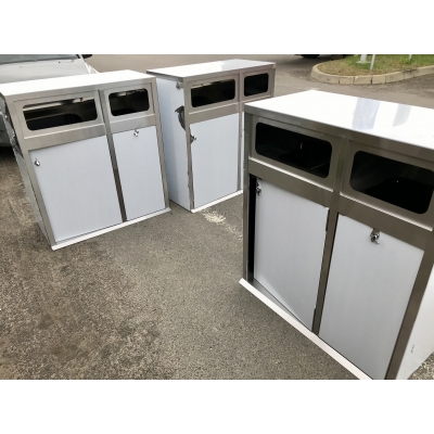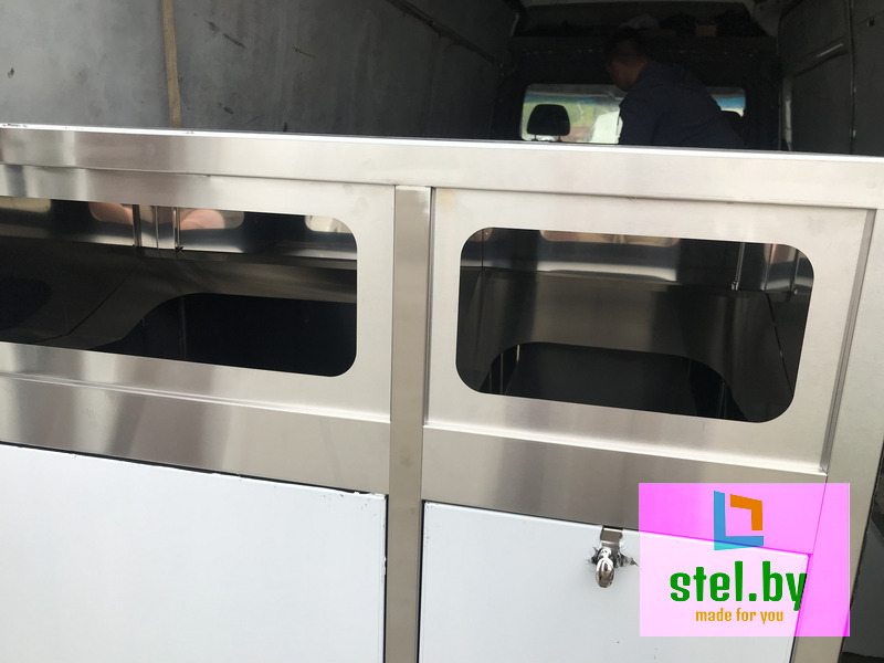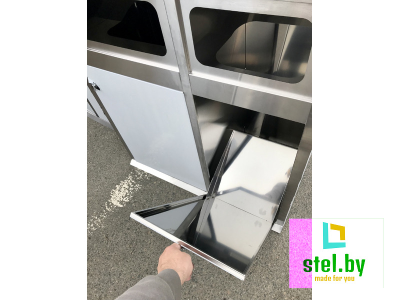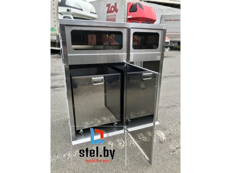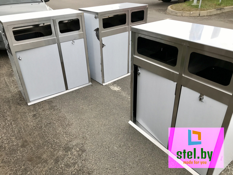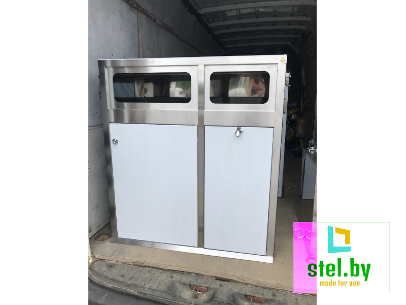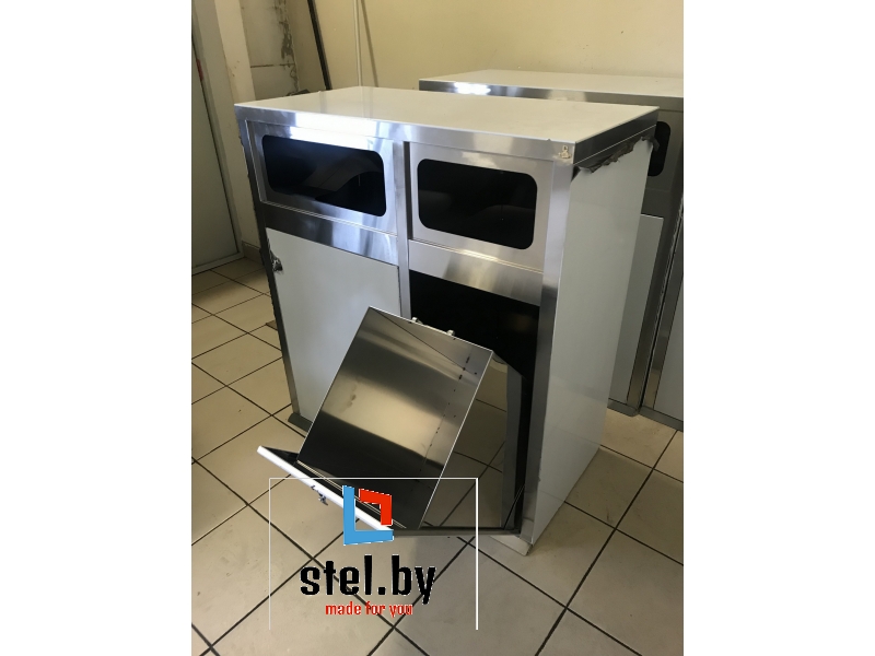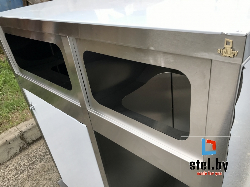 Урна для раздельного сбора мусора (2-е секции) из нержавеющей стали AISI 430, предназначена для сбора одноразовой посуды и хранения использованных подносов на предприятиях общественного питания. 1000х500х1095 мм