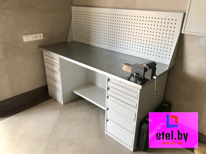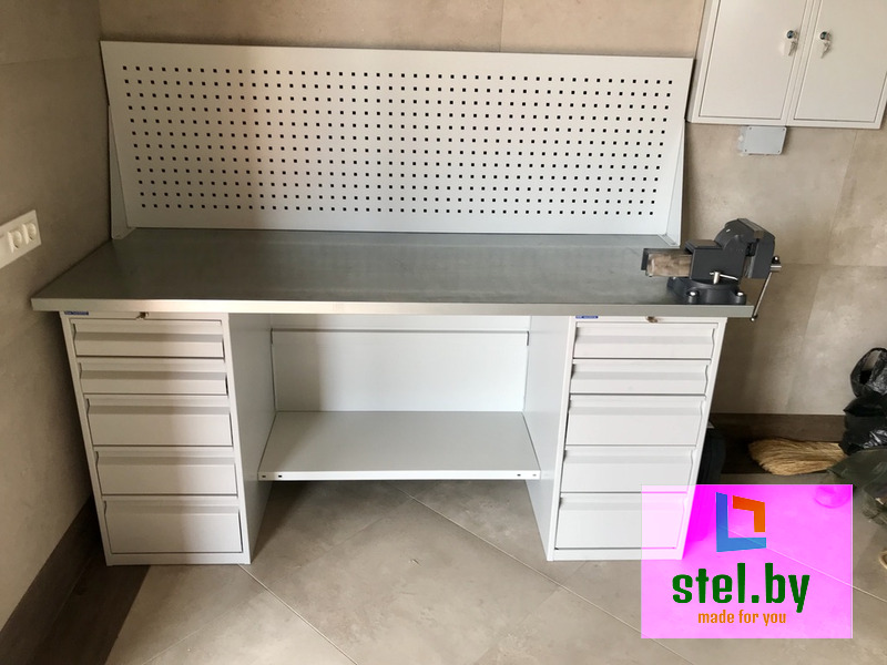 Верстак слесарный для гаража или мастерской. Отлично подходит для мелких работ, рихтовки заготовок и различных операций, требующих ручного инструмента. Изготовлен из высококачественной стали с полимерным покрытием. Нагрузка на один ящик (если есть в комплектации) составлят 25 килограмм. Может комплектоваться перфорированным экраном для размещения ручного инструмента. Отичный выбор для организации рабочего места в домашних условиях и рабочих мастерских.